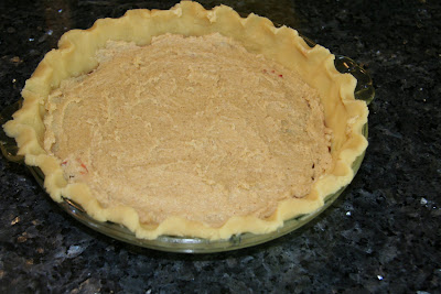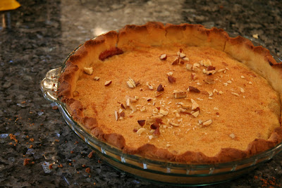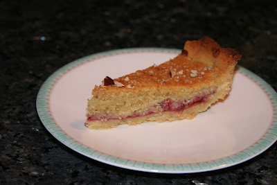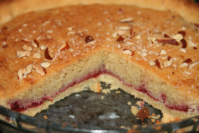 Remove shell from freezer, spread as even a layer as you can of jam onto the pastry base. Top with frangipane, spreading to cover the entire surface of the tart. Smooth the top and pop into the oven for 30 minutes. Five minutes before the tart is done, the top will be poofy and brownish. Remove from oven and strew flaked almonds on top and return to the heat for the last five minutes of baking. I cooked it for 5 minutes longer, but do as you see fit =D.