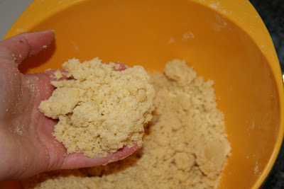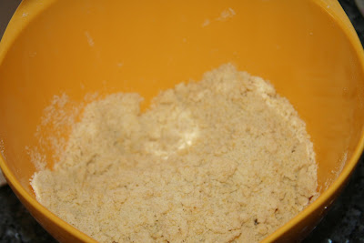 Sift together flour, sugar and salt. Grate butter into the flour mixture, using the large hole-side of a box grater. Using your finger tips only, and working very quickly, rub the fat into the flour until the mixture resembles bread crumbs. Set aside.