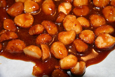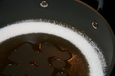 Put the sugar in a heavy 10-inch skillet. Heat on low flame for about 10-20 min until the sugar melts around the edges. Do not stir the sugar. Swirl the pan if necessary to prevent the melted sugar from burning. Brush the sides of the pan with water to remove sugar crystals. If the sugar in the center does not melt, stir briefly. When the sugar is completely melted and caramel in color, remove from heat. Stir in the nuts with a wooden spoon and separate the clusters. Return to low heat and stir to coat the nuts on all sides. Cook until the mixture starts to bubble. **Remember - extremely hot mixture.** Then onto the parchment lined sheet and spread as evenly as possible. As it cools, it will harden into brittle. Break the candied nuts into pieces and place them in the food processor. Pulse into a medium-fine crunch or process until the brittle turns into a powder. To make paste, process for several minutes. Store in an airtight container and store in a cook dry place. Do not refrigerate.