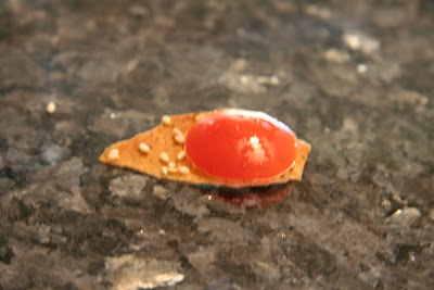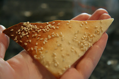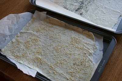 5. Preheat the oven to 350 degrees Fahrenheit with the oven rack on the middle shelf. Mist the top of the dough with water and sprinkle a covering of seeds or spices on the dough (such as alternating rows of poppy seeds, sesame seeds, paprika, cumin seeds, caraway seeds, kosher or pretzel salt, etc.) Be careful with spices and salt - a little goes a long way. If you want to precut the cracker, use a pizza cutter (rolling blade) and cut diamonds or rectangles in the dough. You do not need to separate the pieces, as they will snap apart after baking. If you want to make shards, bake the sheet of dough without cutting it first.