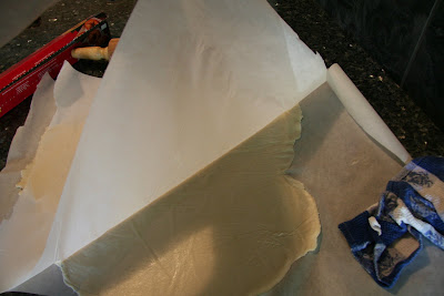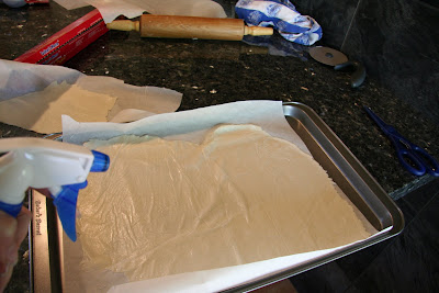 4. For Gluten Free Cracker Dough: Lay out two sheets of parchment paper. Divide the cracker dough in half and then sandwich the dough between the two sheets of parchment. Roll out the dough until it is a paper thin sheet about 15 inches by 12 inches. Slowly peel away the top layer of parchment paper. Then set the bottom layer of parchment paper with the cracker dough on it onto a baking sheet.